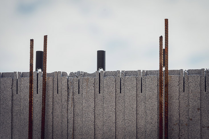 Stavba se zakládá vždy od rohu objektu ze sestavených tvarovek. U první řady navíc použijeme malé plastové příčky ve spodní části tvarovek. A to z toho důvodu, aby nedocházelo k roztahování stěn během první betonáže. Druhá a třetí řada se následně díky převazbě a systému zámků chová jako celek. Tento krok usnadňuje kontrolu rovin a dává možnost napravit případné nerovnosti.